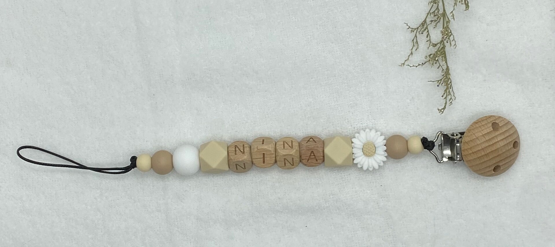 Gemaakt van veilige, BPA-vrije siliconen kralen en natuurlijk beukenhout, en met zorg samengesteld in de mooiste kleuren. Het speenkoord houdt de speen altijd binnen handbereik, terwijl de bijtring verzacht bij doorkomende tandjes.